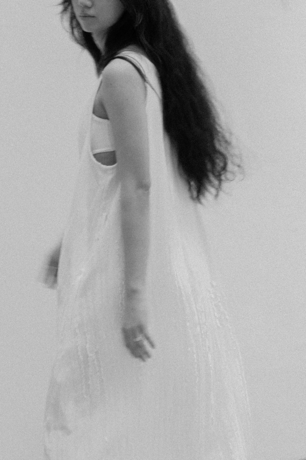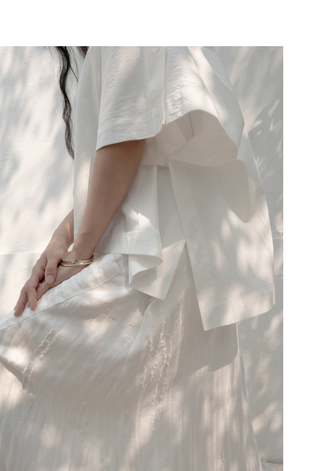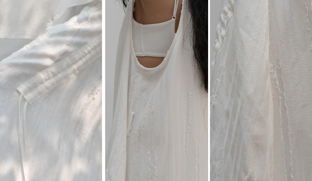 겹쳐지고 접히며 만들어진 실루엣, 몸의 결을 따라 흐르거나 흩어지는 구조들.