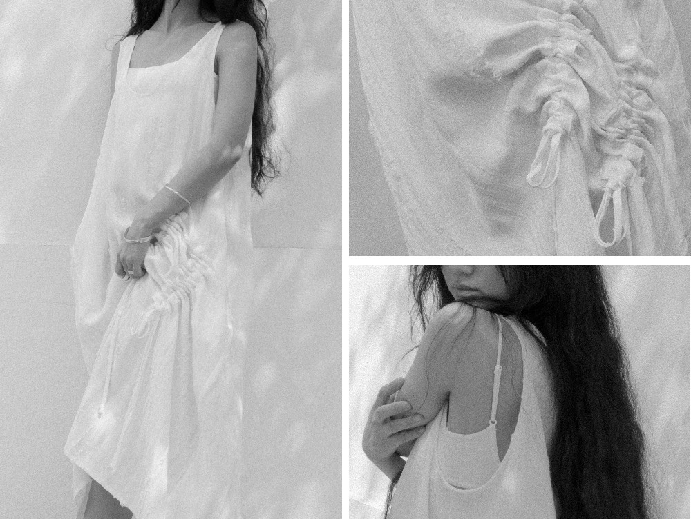 얇지만 적당한 무게감으로 흐르는듯한 소재, 테슬드레스를 닮은 결에 스트링 디테일을 더해